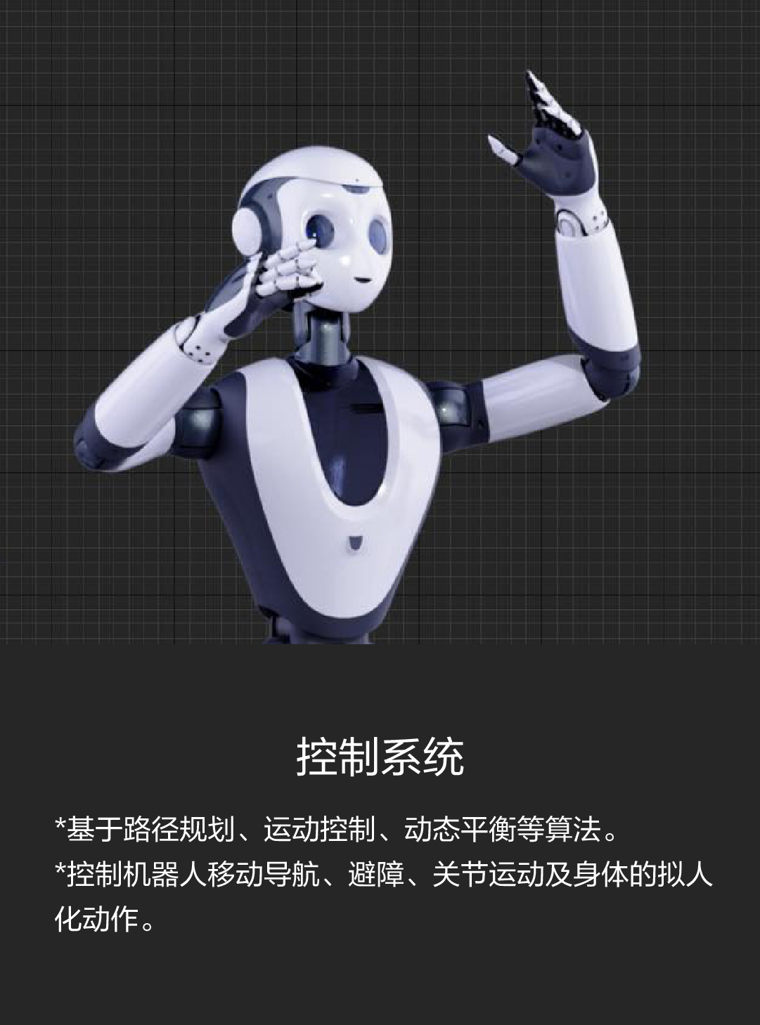 *控制机器人移动导航、避障、关节运动及身体的拟人化动作。